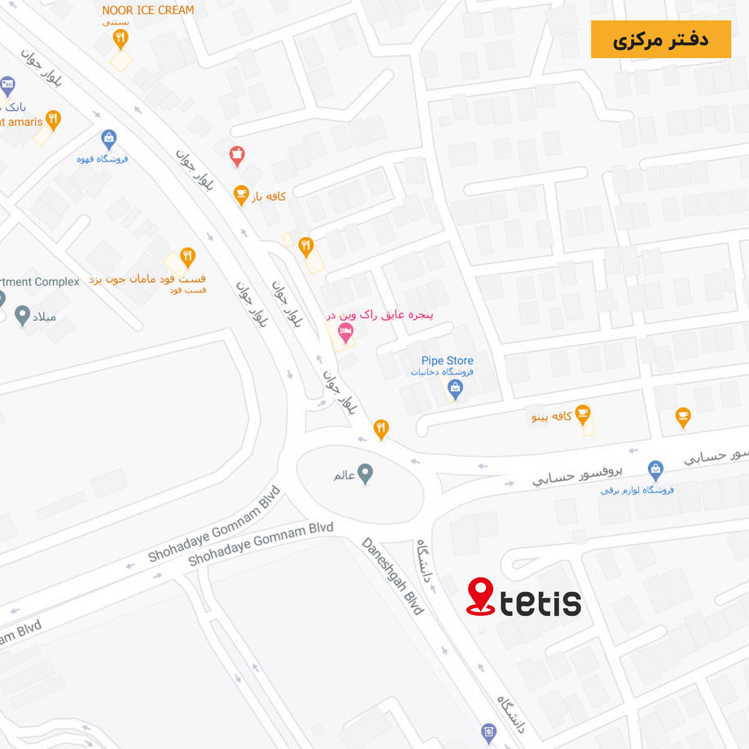 دفتر مركزی : يزد، صفاييه، بلوار دانشگاه، نرسيده به ميدان عالِم، ساختمان تتيس، كدپستی :8915814156