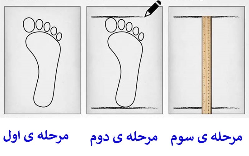 پای خود را روی سطحی صاف قرار دهید می توانید از کاغذ هم استفاده کنید و به صورت عمود و دقیق پاشنه و نوک شصت را علامت گذاری کنید.